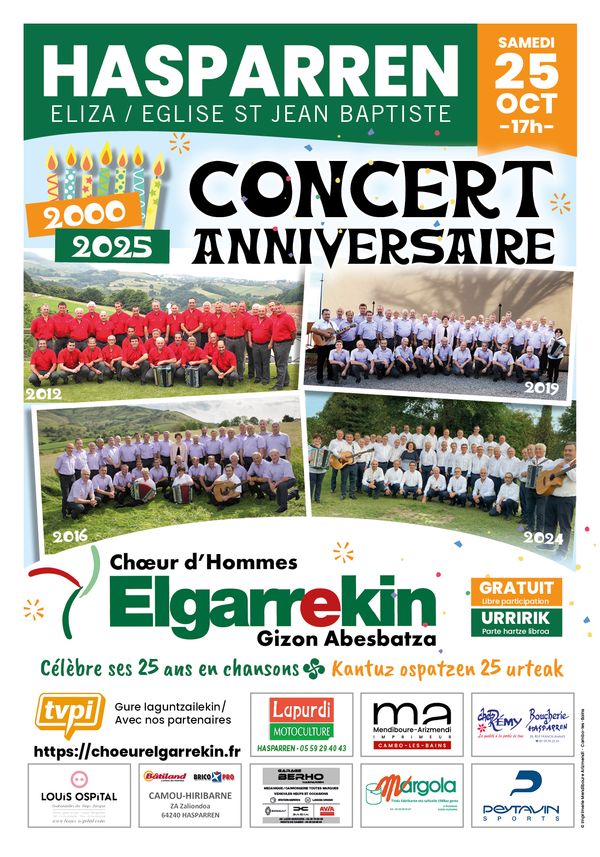 Le chœur d’hommes ELGARReKIN d’Hasparren offrira un concert gratuit en l’église Saint-Jean Baptiste le samedi 25 octobre à 17H00 à l’occasion de ses 25 ans.