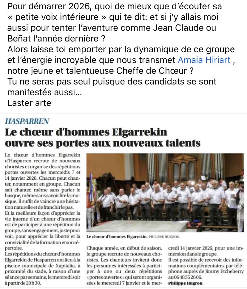 Les prochaines répétitions «portes ouvertes» dédiées au recrutement de nouveaux choristes auront lieu les mercredis 7 et 14 janvier 2026 à 20H30, dans la salle de répétition du groupe située dans les locaux de la piscine municipale, quartier Xapitalia, à proximité du stade, à Hasparren.
